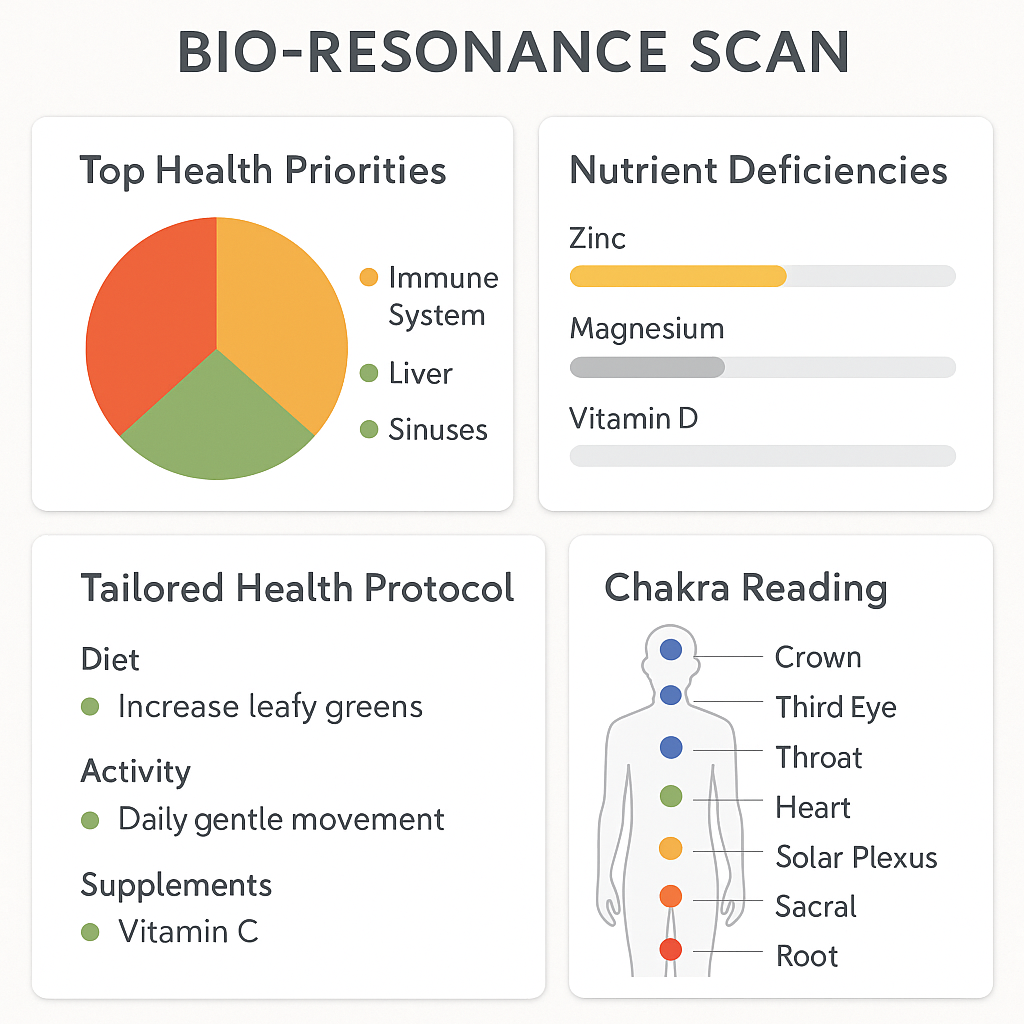 Using advanced frequency technology, this scan identifies your top 3 health priorities, such as gut imbalances, inflammation, detox overload, immune stress and energetic blockages, so you're no longer guessing where to focus.